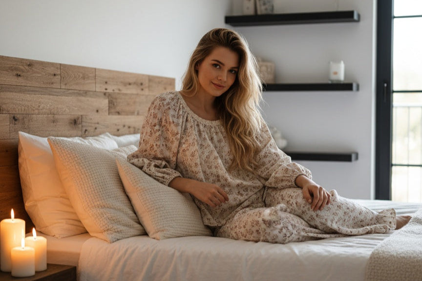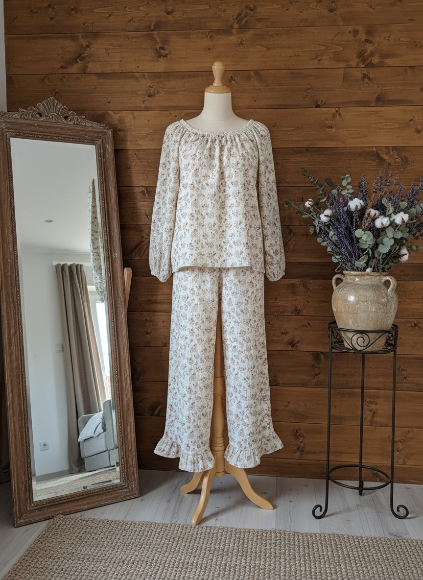 Pijama Bej cu Flori de Toamnă din Muselină și Dantelă la Gât