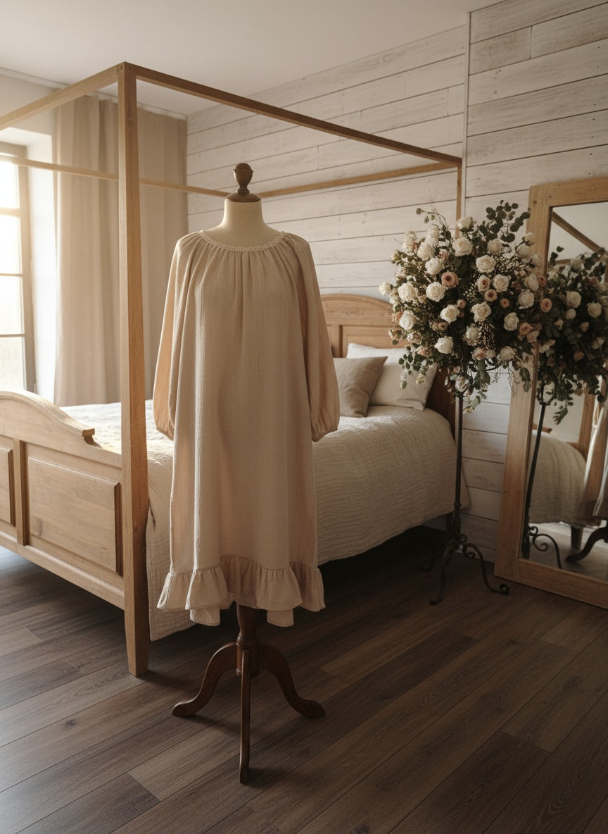 Rochia de noapte lungă din muselină bej îmbină eleganța atemporală cu confortul natural al bumbacului. Textura moale și aerată a muselinei oferă o senzație plăcută pe piele, în timp ce croiala fluidă urmează linia corpului, asigurând libertate de mișcare și un aspect grațios.
