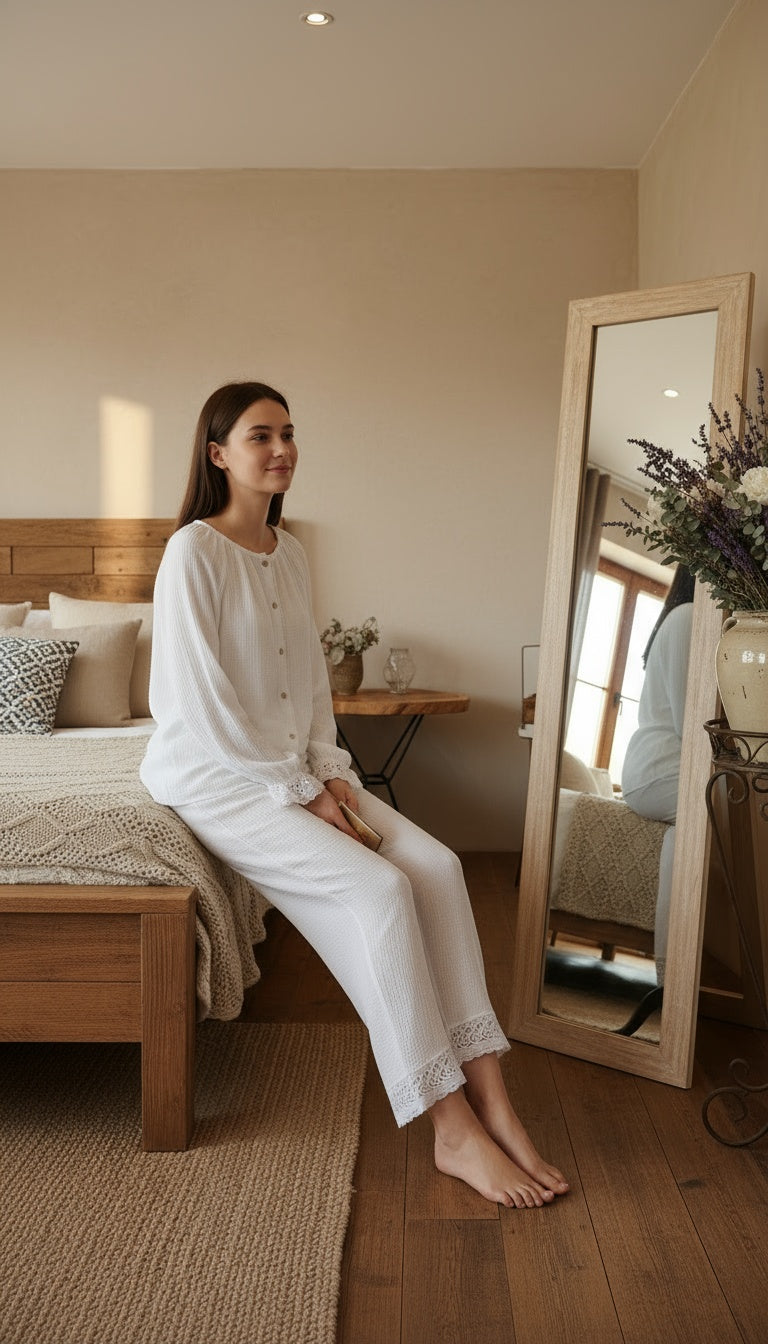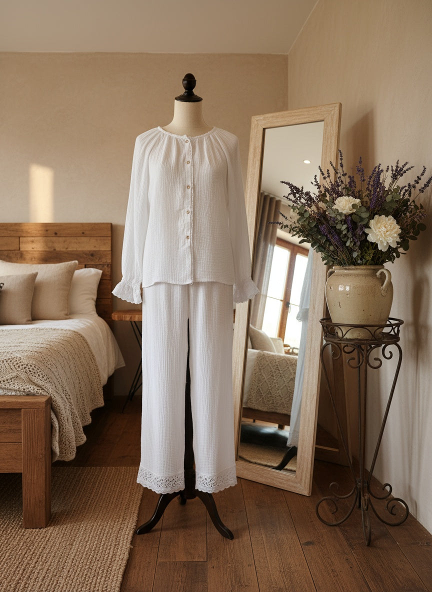 Elegantă și atemporală, această pijama din muselină albă aduce împreună confortul natural și rafinamentul detaliilor fine. Cămașa cu nasturi și marginile din dantelă delicată conferă un aer romantic, subtil și feminin. Croiala lejeră și textura fluidă completează perfect echilibrul dintre simplitate și stil.